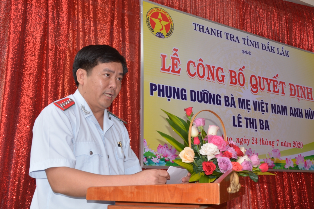 Ngày 24-7, Thanh tra tỉnh Đắk Lắk đã tổ chức Lễ công bố quyết định nhận phụng dưỡng Mẹ Việt Nam Anh hùng Lê Thị Ba (trú tại tổ dân phố 3, thị trấn Buôn Trấp, huyện Krông Ana).