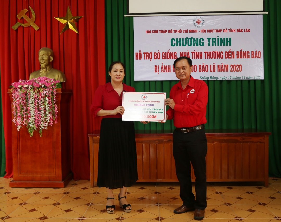 Chiều 15-12, tại xã Hòa Lễ (huyện Krông Bông), Hội Chữ thập đỏ tỉnh phối hợp với Hội Chữ thập đỏ TP. Hồ Chí Minh tổ chức Chương trình hỗ trợ bò giống, nhà Tình thương cho các gia đình nghèo thuộc các huyện M’Drắk, Ea Kar và Krông Bông bị ảnh hưởng do mưa lũ năm 2020.