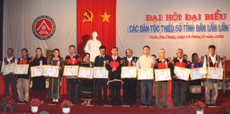 | Tuyên dương khen thưởng những cá nhân có thành tích xuất sắc tại Đại hội các dân tộc thiểu số tỉnh Dak Lak lần thứ I-2010. (Ảnh: Phạm Huỳnh) |