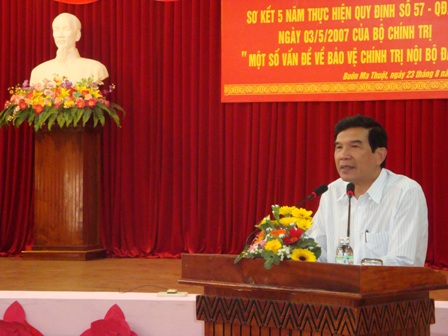 Thực hiện Quy định số 57 của Bộ Chính trị, Ban Thường vụ Tỉnh ủy đã chỉ đạo các huyện ủy, thị ủy, thành ủy, đảng ủy trực thuộc quán triệt cho cấp ủy cơ sở về các văn bản của Trung ương và của tỉnh về công tác bảo vệ chính trị nội bộ Đảng và đã đạt được nhiều kết quả quan trọng. Nổi bật là việc rà soát tiêu chuẩn chính trị phục vụ kịp thời công tác phát triển Đảng, công tác nhân sự Đại hội Đảng các cấp nhiệm kỳ 2010-2015; bầu cử đại biểu Quốc hội khóa XIII, đại biểu Hội đồng Nhân dân các cấp nhiệm kỳ 2011-2016 và công tác nhân sự thường xuyên theo yêu cầu của công tác tổ chức, cán bộ. …