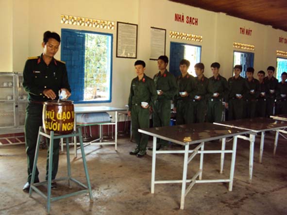 | Cán bộ, chiến sĩ tiểu đoàn 303 tiết kiệm gạo từ khẩu phần ăn để giúp đỡ các hộ gia đình khó khăn. |