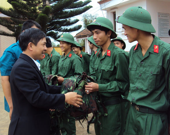 | Lãnh đạo xã Ea Kmút (huyện Ea Kar) động viên thanh niên nhập ngũ. |