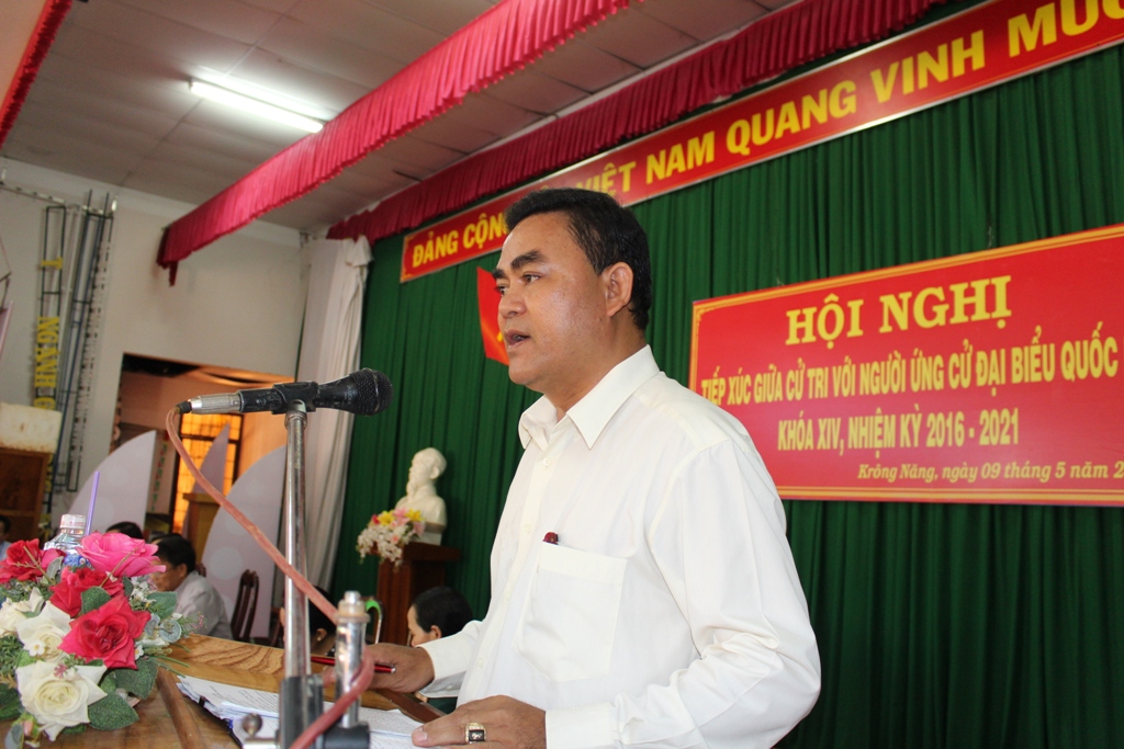 Ngày 9-5, các ứng cử viên đại biểu Quốc hội khóa XIV, nhiệm kỳ 2016-2021 thuộc đơn vị bầu cử số 3 gồm các ông, bà: Y Biêr Niê, Phó Bí thư Tỉnh ủy, Chủ tịch HĐND tỉnh; Vũ Đức Côn, Phó Giám đốc Sở Nông nghiệp và Phát triển nông thôn; Đặng Xuân Phương, Phó viện trưởng Viện Nghiên cứu lập pháp thuộc Ủy ban Thường vụ Quốc hội; Nguyễn Trung Thành, Phó Giám đốc Sở Y tế; Lê Thị Thanh Xuân, Hiệu trưởng Trường Trung cấp Sư phạm mầm non tỉnh đã có buổi tiếp xúc với cử tri các xã, thị trấn huyện Krông Năng.