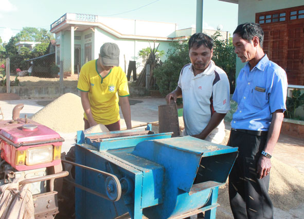 | Ông Y We Ktla (bên phải) thăm hỏi tình hình sản xuất, đời sống của bà con trong buôn. |