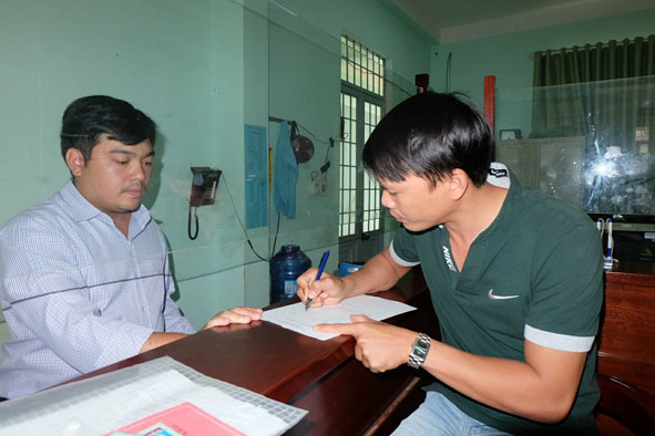 | Cán bộ phường An Bình (thị xã Buôn Hồ) hướng dẫn người dân về thủ tục hành chính tại bộ phận tiếp nhận và trả kết quả hồ sơ. |