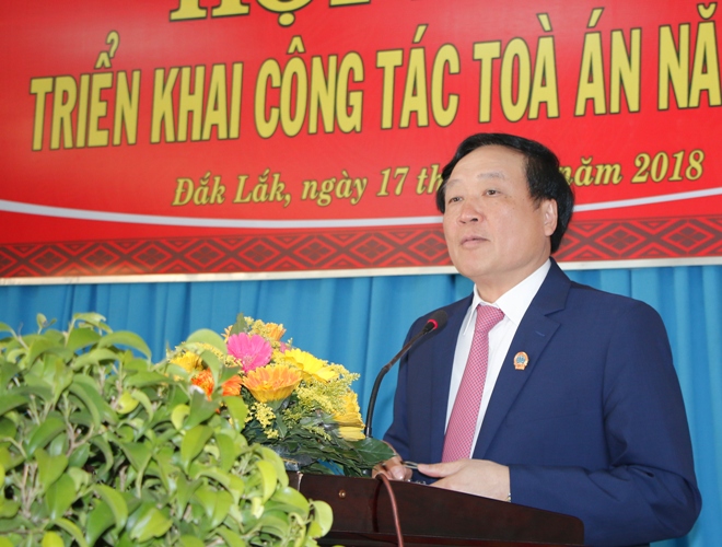 Phát biểu chỉ đạo tại hội nghị, Chánh án TAND Tối cao Nguyễn Hòa Bình yêu cầu TAND hai cấp tỉnh Đắk Lắk cần tập trung tổ chức thực hiện có hiệu quả 14 nội dung quan trọng trong năm 2018 đã được xác định tại Hội nghị triển khai công tác Tòa án toàn quốc năm 2018 vừa qua; chú trọng công tác hòa giải và đối thoại trong giải quyết các vụ án dân sự, hành chính; chủ động triển khai thực hiện các luật, pháp lệnh được Quốc hội, Ủy ban Thường vụ Quốc hội thông qua có liên quan tới tổ chức và hoạt động của tòa án, nhất là Luật Sửa đổi, bổ sung một số điều Bộ luật Hình sự 2015 và Bộ luật Tố tụng Hình sự năm 2015; tiếp tục tăng cường và mở rộng các hoạt động hợp tác quốc tế với Tòa án sơ thẩm tỉnh Mondulkiri (Vương quốc Campuchia) và TAND tỉnh Chămpasắc (Lào).
