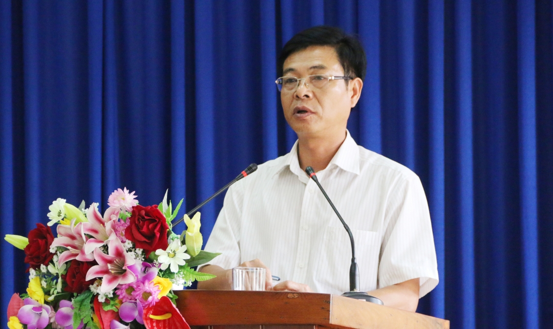 | Phó Bí thư Thường trực Huyện ủy Ea Kar Vương Tấn Thành báo cáo tình hình thực hiện nhiệm vụ công tác 6 tháng đầu năm của huyện. |