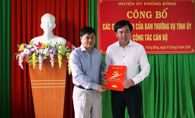 | Phó Bí thư Thường trực Tỉnh ủy Phạm Minh Tấn trao Quyết định luân chuyển và chỉ định giữ chức danh Bí thư Huyện ủy Krông Bông cho đồng chí Lê Nam Cao. |