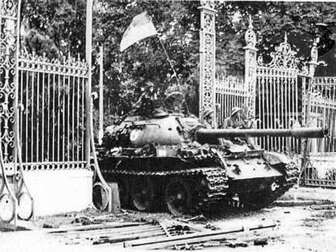 | Xe tăng quân giải phóng húc đổ cổng Dinh Độc lập ngày 30-4-1975. Ảnh tư liệu |