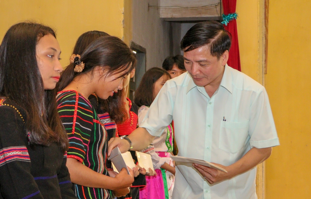 | Ủy viên Trung ương Đảng, Bí thư Tỉnh ủy Bùi Văn Cường trao học bổng tặng học sinh nghèo vượt khó. Ảnh: H.Gia |