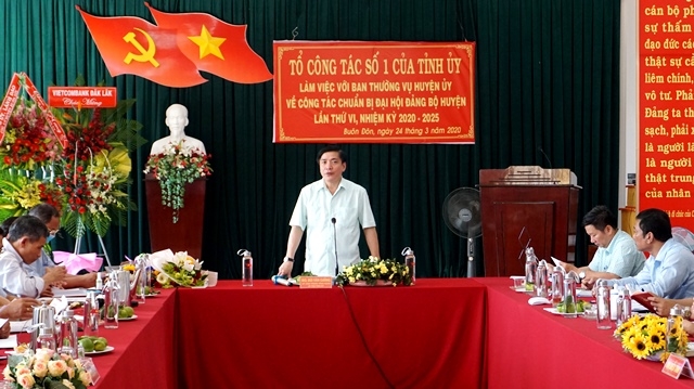 Phát biểu kết luận buổi làm việc, Bí thư Tỉnh ủy Bùi Văn Cường ghi nhận công tác chuẩn bị đại hội đảng các cấp được triển khai một cách kỹ lưỡng, đúng quy định của Ban Thường vụ Huyện ủy Buôn Đôn, đồng thời yêu cầu huyện cần nghiêm túc tiếp thu những đóng góp của các thành viên trong Tổ công tác để việc triển khai đại hội được hoàn thiện và thành công hơn. Công tác chuẩn bị nội dung cho văn kiện đại hội các cấp phải được đầu tư chi tiết, cụ thể, chu đáo. Đặc biệt, các xã, thị trấn cần chú trọng vào việc hoàn thiện các văn kiện đại hội ngay từ cấp cơ sở. Việc lựa chọn, giới thiệu nhân sự tham gia cấp ủy cần thực hiện một cách chặt chẽ theo đúng quy trình, cơ cấu giới tính, độ tuổi.