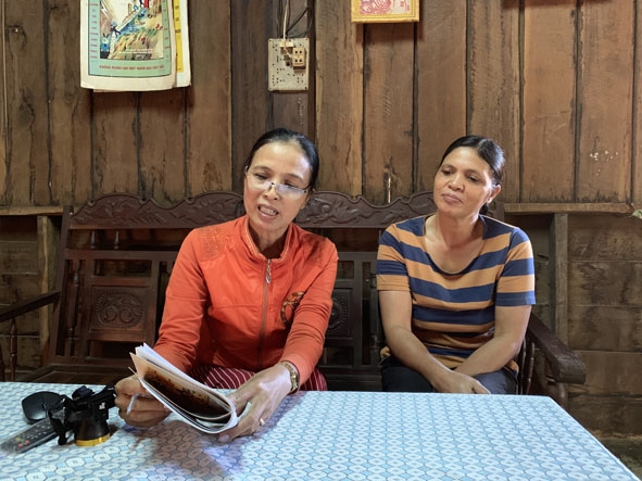 | Bà H'Blẽn Byă (trái) đang tuyên truyền cho người dân trong buôn về chính sách của Nhà nước dành cho đồng bào dân tộc thiểu số. |