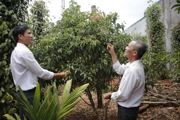 | Ông Nguyễn Xuân Hoàng, Phó Bí thư Thường trực Đảng ủy xã Cư Klông (bên trái) tham quan mô hình trồng vải xen tiêu của gia đình đảng viên. |