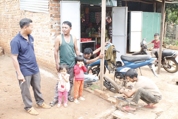 | Cán bộ buôn Tung Krăk (xã Ea Drông) trao đổi về công tác làm đường với người dân trong buôn. |