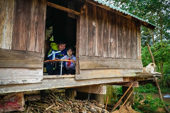 | Anh Nguyễn Duy Học hướng dẫn sử dụng đèn học, một trong những dụng cụ học tập được tặng cho học sinh ở buôn M'Bê, xã Krông Búk, huyện Krông Pắc trong chuyến thiện nguyện năm 2019. |