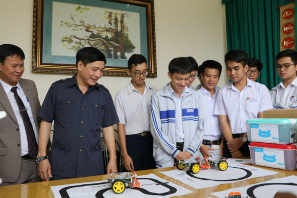| Bí thư Tỉnh ủy Bùi Văn Cường tham quan mô hình STEM dành cho học sinh Trường THPT Chuyên Nguyễn Du. Ảnh: Hoàng Gia |