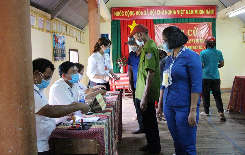 Tại buôn Ea Tiêu (xã Ea Tiêu, huyện Cư Kuin), từ 5 giờ sáng, cử tri đã bắt đầu đến điểm bầu cử. Ý thức cao công tác phòng dịch, bà con đeo khẩu trang, sát khuẩn tay, giữ khoảng cách an toàn.