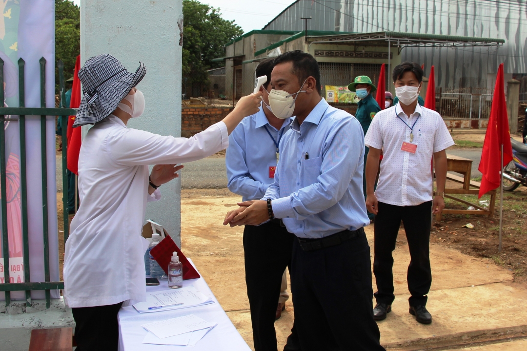 | Phó Chủ tịch UBND tỉnh Y Giang Gry Niê Knơng được cán bộ y tế xã Tân Tiến đo thân nhiệt trước khi kiểm tra Điểm bỏ phiếu số 3, xã Tân Tiến |