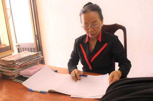 | Bí thư Chi bộ tổ dân phố 10 (TP. Buôn Ma Thuột) Đinh Thị Hoa miệt mài với công việc của tổ dân phố. |