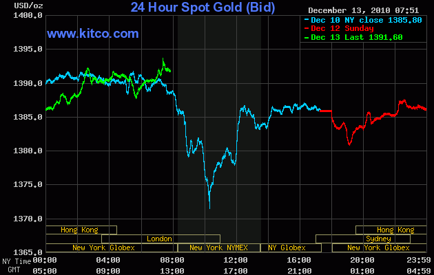 | Cập nhật lúc 8 giờ, ngày 13-12 - Giờ New York, giá vàng trên thị trường thế giới lúc mở phiên giao dịch đầu tuần hiện đang ở mức 1.391,60 USD/oz. (Ảnh: Kitco) |