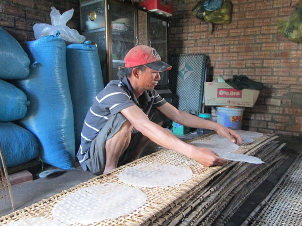 | Xã viên HTX Dịch vụ nông nghiệp Hòa Nhơn kiểm tra bánh tráng trước khi thu gom. |