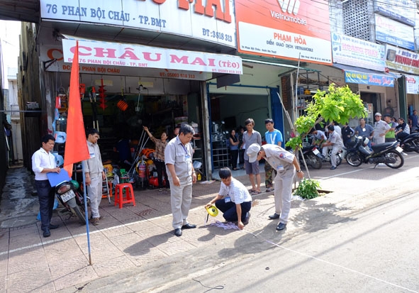 | Lực lượng chức năng phường Thống Nhất đo đạc chỉ giới xác định các công trình lấn chiếm vẻ hè. |
