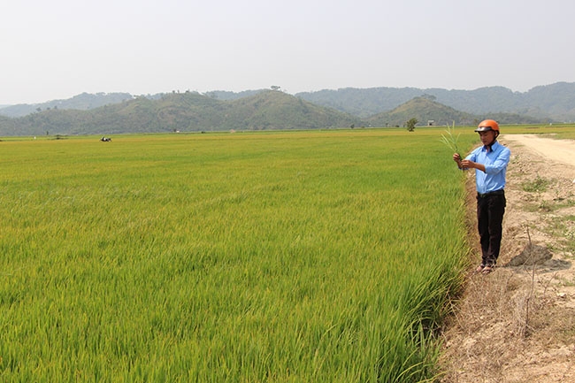 | Cán bộ nông nghiệp xã Bình Hòa, huyện Krông Ana kiểm tra tình hình sinh trưởng của lúa đông xuân 2017-2018. |