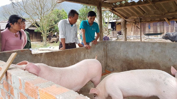 | Hướng dẫn viên cộng đồng (bìa phải) giám sát tiểu dự án sinh kế nuôi heo ở xã Cư Đrăm (huyện Krông Bông). |
