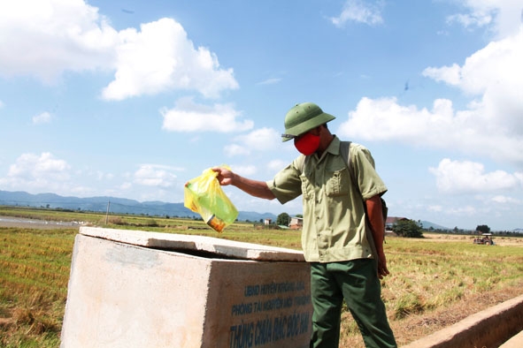 | Người dân xã Bình Hòa bỏ bao bì thuốc bảo vệ thực vật sau sử dụng vào bể chứa. |