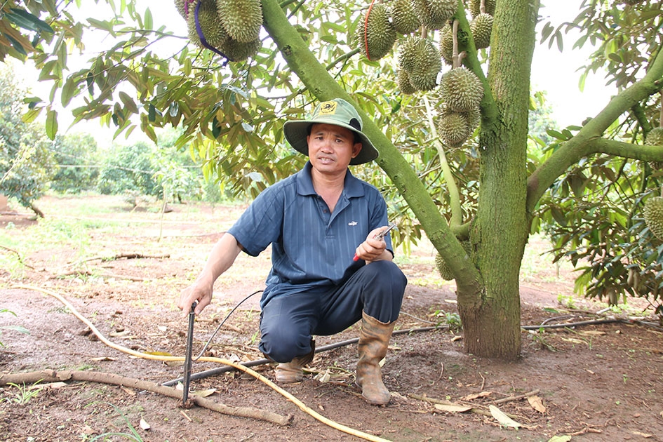 Tương tự, hộ anh Phan Gia Phương (xã Tam Giang, huyện Krông Năng) cũng đã mạnh dạn đầu tư 25 triệu đồng để lắp đặt hệ thống tưới nước tiết kiệm cho 1,2 ha trồng sầu riêng. Anh cho biết, trước tình hình biến đổi khí hậu hiện nay thì mọi cây trồng đều có khả năng bị thiếu nước, nhất là các loại cây trồng lâu năm. Riêng với cây sầu riêng, một đặc điểm khác biệt là cây cần nước trong suốt chu kỳ phát triển nhưng chỉ cần vừa đủ, nhiều hay ít quá đều không được. Do đó, sử dụng hệ thống tưới tiết kiệm là biện pháp hữu hiệu, đáp ứng được nhu cầu sinh lý của cây. Từ khi lắp hệ thống này, ngoài việc tiết kiệm được nước, anh còn chủ động được công, tiết kiệm được hơn 10 triệu đồng/năm.