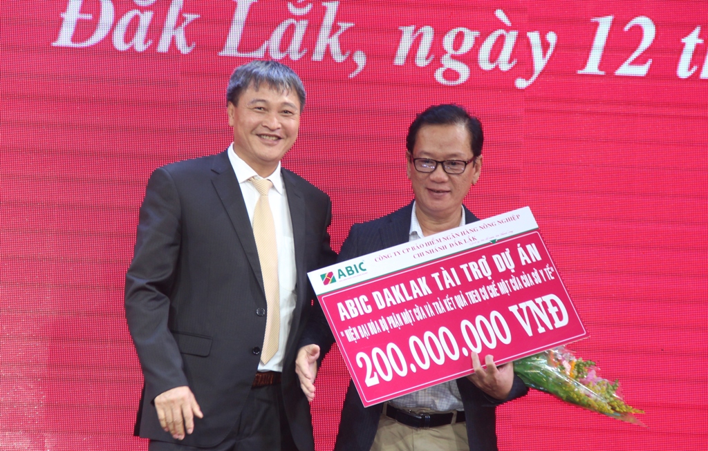 | Giám đốc ABIC Đắk Lắk Đặng Văn Liễu trao bảng tài trợ tượng trưng cho đại diện Sở Y tế Đắk Lắk |