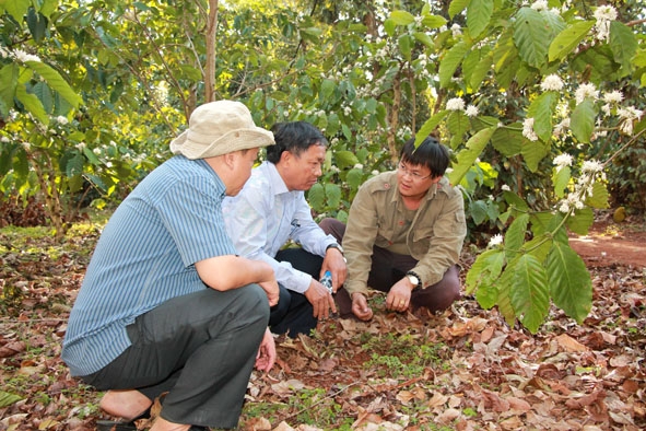 | Lãnh đạo Sở Nông nghiệp - Phát triển nông thôn và Công ty TNHH Đầu tư Du lịch và Thương mại Đam San tham quan, tìm hiểu nông trại cà phê hữu cơ của anh Đặng Văn Huy. |