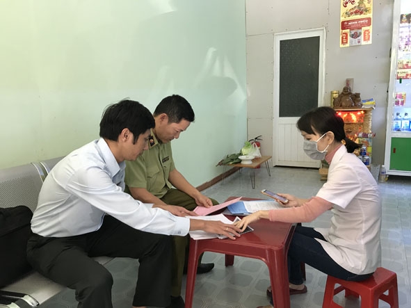 | Lực lượng chức năng kiểm tra hóa đơn chứng từ hàng hóa là vật tư y tế tại một nhà thuốc ở TP. Buôn Ma Thuột. |