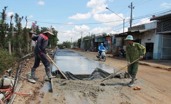 | Người dân xã Ea Hu (huyện Cư Kuin) thực hiện bê tông hóa đường nông thôn. |
