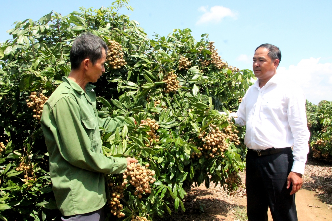 | Bí thư Huyện ủy Ea Kar Y Nhuân Byă (bên phải) thăm mô hình trồng nhãn hương chi của nông dân xã Ea Tih. |