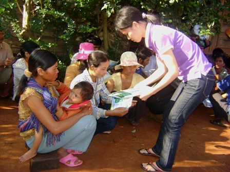 | Cán bộ Phòng Truyền thông (Trung tâm Nước sạch và vệ sinh môi trường nông thôn tỉnh) phát tờ rơi tuyên truyền cho bà con |