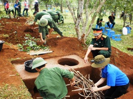 | Đoàn viên và chiến sĩ đi lấy nước nấu cơm. |