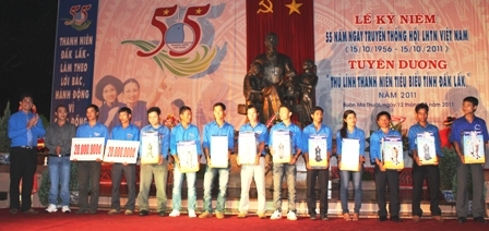 Ngày 12-10, tại Tượng đài Bác Hồ với các cháu thiếu nhi các dân tộc Dak Lak, Hội LHTNVN tỉnh đã tổ chức Lễ kỷ niệm 55 năm Ngày truyền thống Hội LHTN Việt Nam (15-10-1956 – 15-10-2011) và Tuyên dương 39 thủ lĩnh thanh niên tiêu biểu toàn tỉnh năm 2011. Đại diện lãnh đạo Ban Chỉ đạo Tây Nguyên, Ủy ban MTTQVN tỉnh, các sở, ban, ngành và các đồng chí nguyên là Chủ tịch Hội LHTNVN tỉnh, Bí thư Tỉnh Đoàn qua các thời kỳ cùng hơn 400 đoàn viên, thanh viên là những cá nhân, tập thể xuất sắc đã về dự.