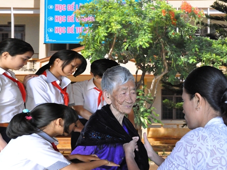 | Chị Trịnh Thị Hương (bìa phải) giải đáp chế độ, chính sách cho cựu TNXP Nguyễn Thị Thích ở thôn 7, xã Hòa An (huyện Krông Pak). |