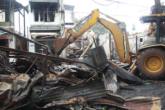 | Cơ quan chức năng đang thu dọn hiện trường vụ cháy |