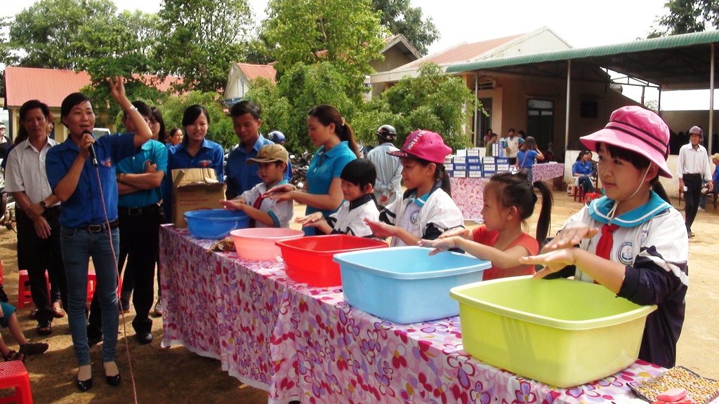 | Đoàn viên, thanh niên huyện Krông Năng hướng dẫn các em học sinh vệ sinh tay chân bằng nước xà phòng. |