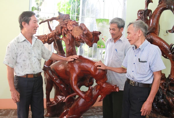 | Thương binh Lê Văn Thuần (bên trái) giới thiệu các tác phẩm điêu khắc gỗ với cán bộ, hội viên người cao tuổi. |