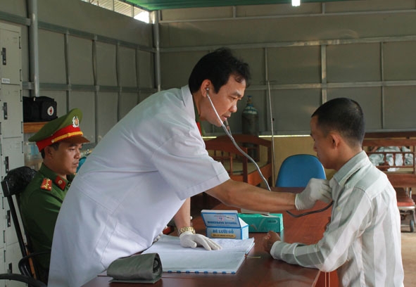 | Trung tá, bác sĩ Cao Huy Vui kiểm tra sức khỏe cho một phạm nhân bị tăng huyết áp. |