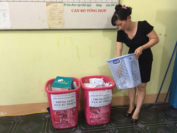 Hơn 3 tháng qua, thay vì vứt bỏ giấy vụn, chai lon vào sọt rác thì các cán bộ trong cơ quan Hội, Mặt trận và đoàn thể huyện Buôn Đôn đã quen với việc bỏ chúng vào thùng giấy có gắn dòng chữ “Thùng giấy vụn từ thiện”. Cuối tuần, các thùng giấy đó sẽ được thu gom lại, cắt nhỏ đem bán. Số tiền thu được sẽ dùng làm nguồn quỹ giúp đỡ những phụ nữ có hoàn cảnh khó khăn tại buôn kết nghĩa (buôn Niêng II, xã Ea Nuôl).