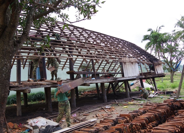Không để người dân sống cảnh màn trời chiếu đất, Bộ Chỉ huy Quân sự tỉnh đã huy động lực lượng cùng nhiều phương tiện đến các thôn, xã bị ảnh hưởng thuộc các huyện Krông Năng, Lắk, Krông Bông, M’Đrắk, Ea Kar, thị xã Buôn Hồ, TP. Buôn Ma Thuột… để giúp nhân dân khắc phục hậu quả cơn bão số 12.