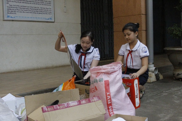 | Cô và trò trường Tiểu học Phan Chu Trinh đang thu gom giấy vụn từ phong trào “Kế hoạch nhỏ”. |