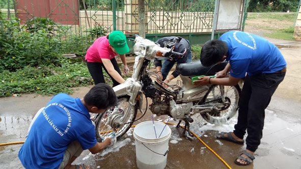 | Điểm rửa xe gây quỹ vì người nghèo của Câu lạc bộ thiện nguyện Sóng xanh được tổ chức tại UBND xã Dang Kang. |