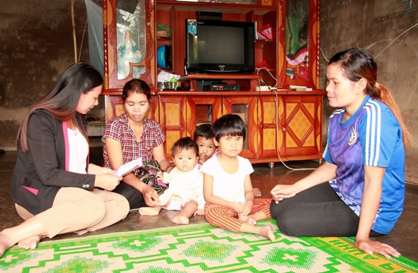 | Cán bộ dân số đến tận nhà tuyên truyền, vận động chị Lò Thị Mỹ thực hiện KHHGĐ. |