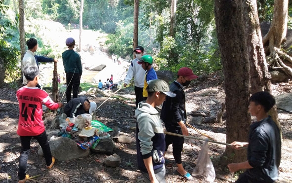 | Đoàn viên thanh niên xã Cư Pui dọn vệ sinh khu vực thác Đắk Tuôr. |