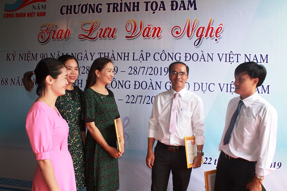 | Thầy Trịnh Hoàng Nhân (ngoài cùng bên phải) chia sẻ kinh nghiệm hoạt động công đoàn với các đồng nghiệp. |